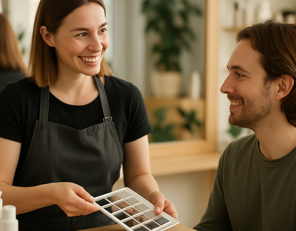 - Konkrete Vorschläge: Schnittvarianten, Farbrichtungen, mögliche Techniken und ihre Vor- und Nachteile werden erklärt. Oft zeigen wir Fotos oder machen ein kurzes Styling-Test.